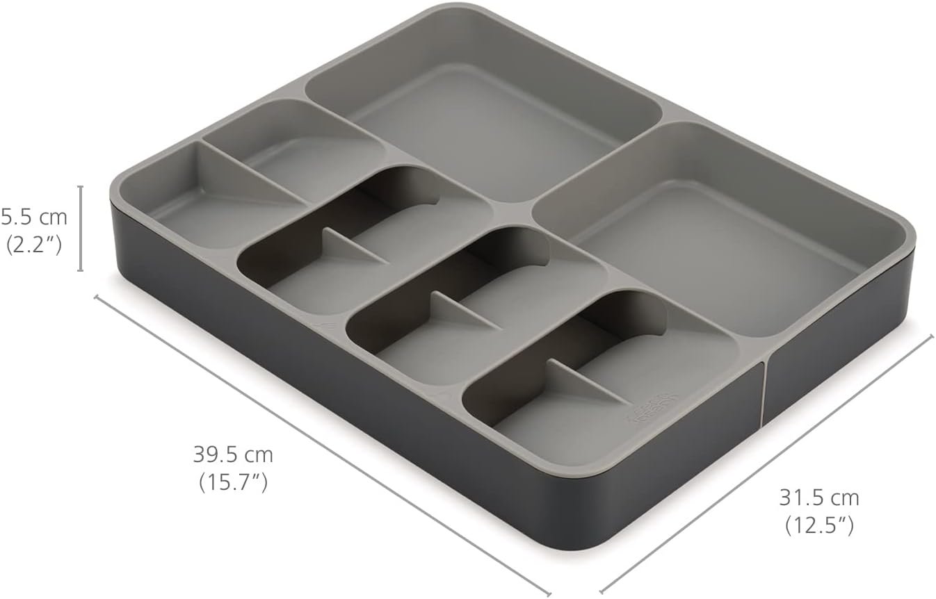 The expandable sides add flexibility, allowing the organizer to adjust to various drawer widths. It fits drawers with a minimum height of 8 cm (3¼ inches), making it compatible with most standard kitchen cabinetry. The addition of twin gadget compartments provides dedicated storage for larger utensils like spatulas, peelers, or serving tools.