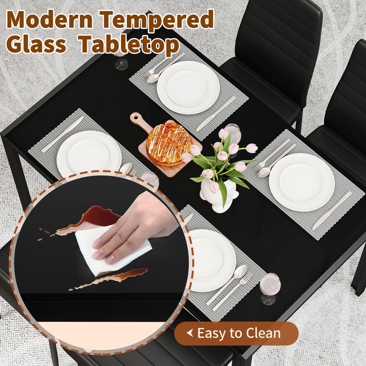 This dining table set for 4 uses a tempered glass tabletop, which adds elegance but requires mindful care. Glass surfaces can be more fragile than wood, especially in homes with pets or children. That said, the smooth surface is easy to clean and resists staining when wiped gently.